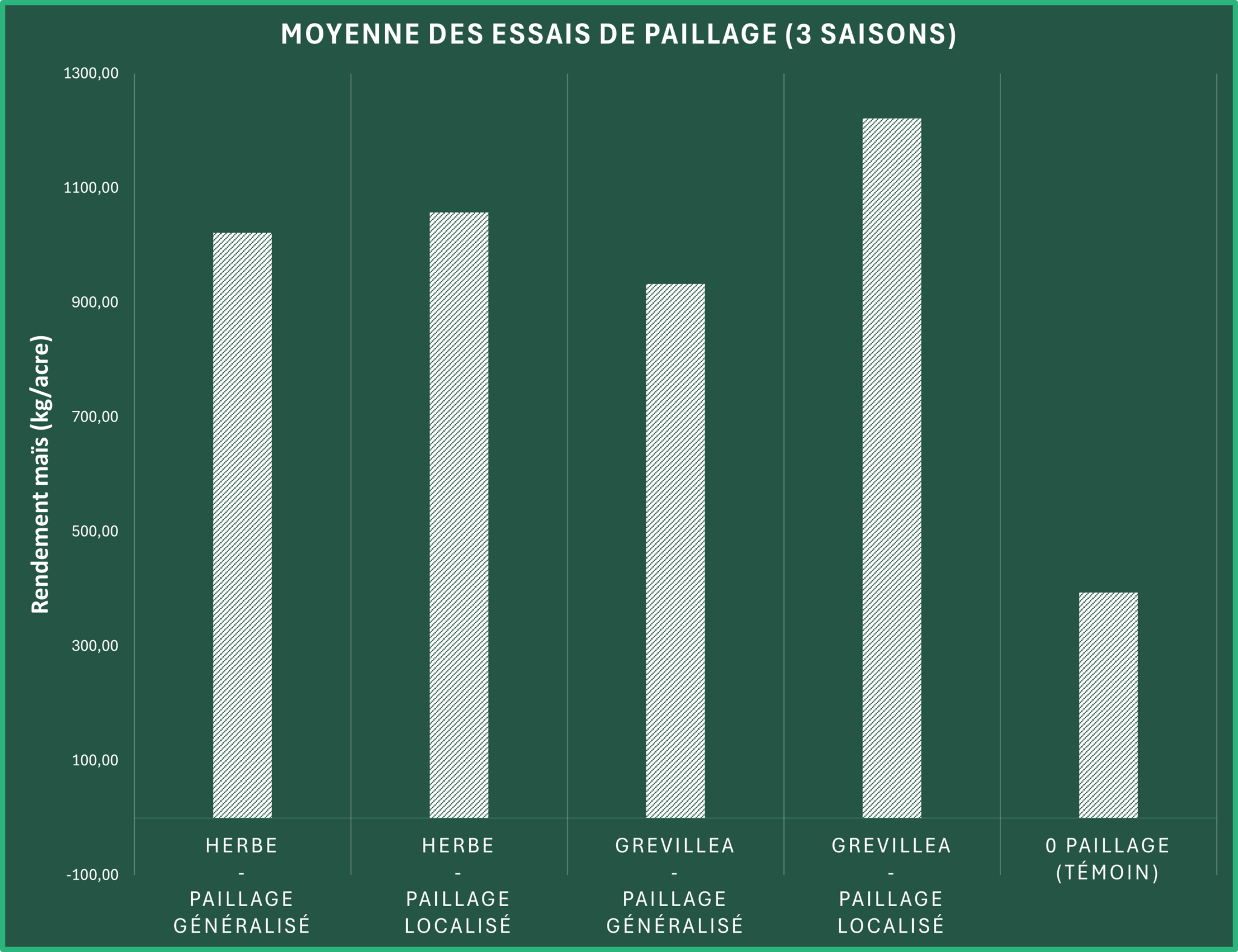 Une autre expérimentation a porté sur la comparaison de différentes stratégies de paillage pour préserver l’humidité du sol et donc assurer une récolte même dans des conditions de sécheresse. La différence significative de rendement entre les parcelles avec paillage et sans paillage a pleinement convaincu les agriculteurs du comté de Laikipia à adopter le paillage, qu’importe sa provenance (Grevillea, herbe ou autre).