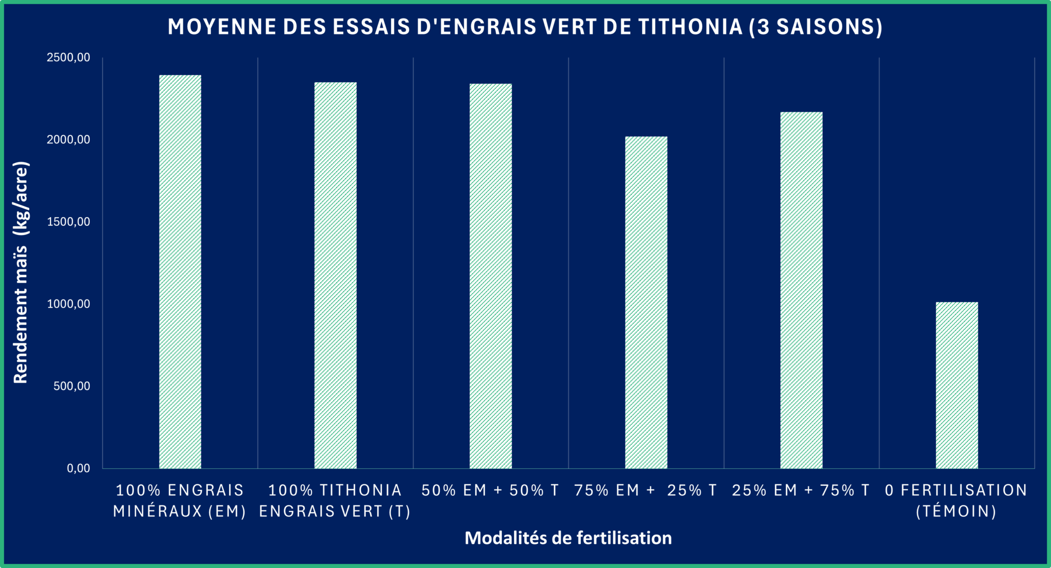 Le graphique ci-contre présente les résultats d’un essai portant sur l’utilisation de Tithonia en tant qu’engrais vert, seul ou en combinaison avec des engrais minéraux (DAP, Di-Ammonique Phosphate) dans différentes proportions.