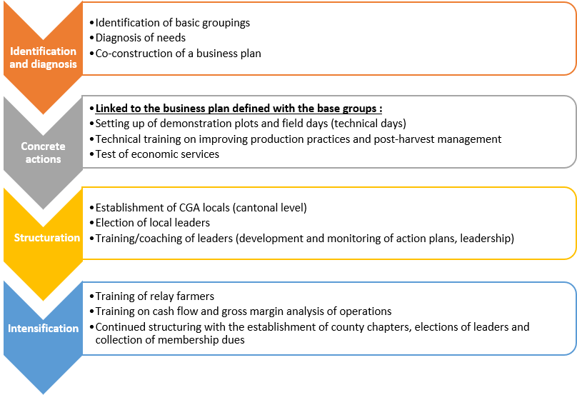 - Putting in place concrete activities and services before structuring: the implementation of the first activities is an integral part of the diagnostic process of the grassroots groups and can enable the re-evaluation of their needs. In addition, it should allow CGA and its members to get to know each other.