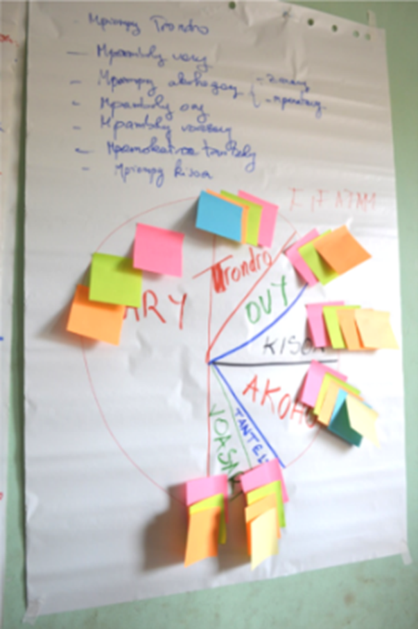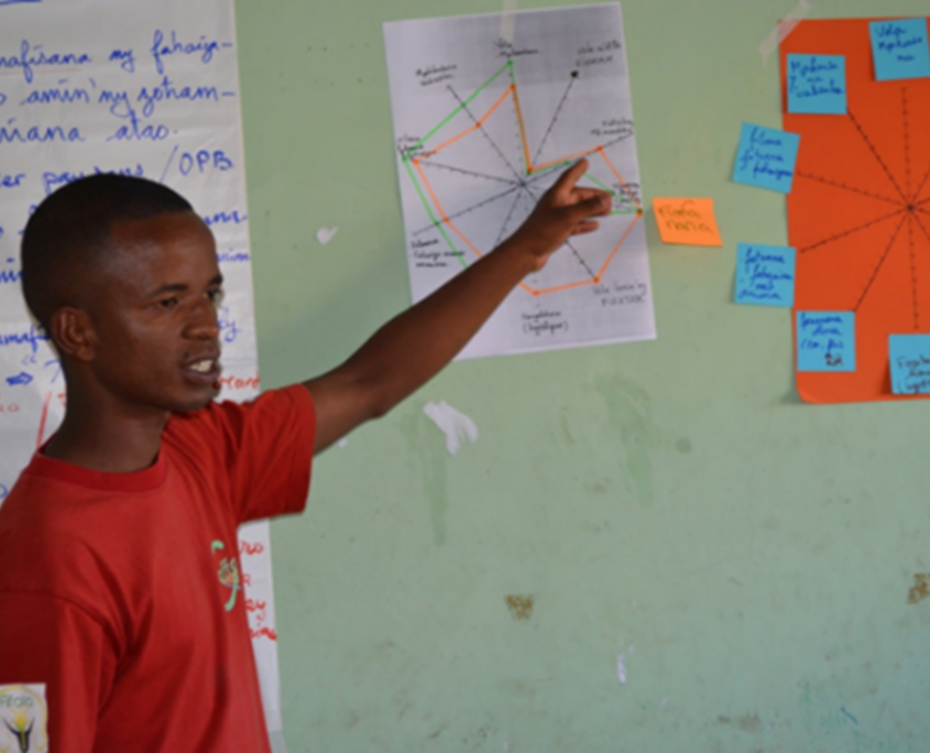 Située en région Amoron’i Mania, cette OP a été accompagnée dans la lecture de son histoire (l’OP hier), puis au travers d’un schéma spider l’utilité de chaque service aux membres et les coûts liés ont été analysés. Ces séances ont donné des éléments aux élus et techniciens pour discuter et planifier la suite des actions. Pour Fifatam, cela a conduit concrètement à revoir les prix de vente des vaccins et la répartition des temps de travail des techniciens.